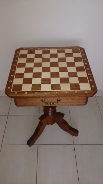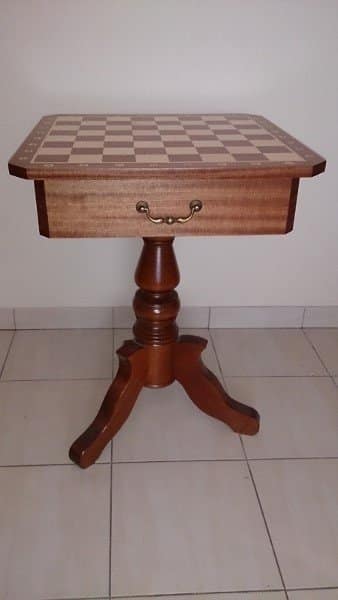 Cette table d’échecs en bois de charme et d’érable est un produit exceptionnel. Elle est recouverte d’une marqueterie d’acajou et le plateau mesure 54 x 54 cm avec une taille de case de 5,8 cm. Elle est équipée de deux tiroirs sous le plateau pour un rangement pratique. Son pied est en bois d’érable, et la hauteur totale de la table est de 74 cm. C’est l’échiquier idéal pour les joueurs de tous niveaux, et qui offre le cadre parfait pour des parties endiablées. Une pièce qui n’est pas à négliger dans votre salle de jeu!