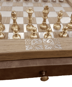 L’ensemble Arabesque II Echiquier en Bois avec Tiroir de Rangement et Jeu d’Echecs Staunton en Laiton est un jeu idéal pour tous les amoureux des échecs. L’échiquier de 35 x 35 cm est fabriqué à partir de bois, d’aluminium et d’un intérieur tiroir en cuir. Chaque case est de 3,5 cm, avec des bords fins et une finition faite à la main. Le tiroir de rangement vous permet de ranger facilement toutes les pièces une fois la partie terminée. Le jeu d’échecs est fait de laiton, avec un plombage pour une meilleure stabilité des pièces. Il a un roi de 5,5 cm de haut et 1,9 cm de diamètre. Chaque pièce est faite à la main et est posée sur une base en feutre pour plus de confort. Ce jeu est produit en Europe et est