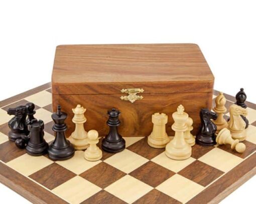 Ensemble Competition Echiquier en Bois de Noyer et d’Erable, Jeu d’Echecs en Bois de Buis & Coffret de Rangement en Bois de Rose Doré – Jeu d’Échecs Luxueux et Coffret de Rangement en Bois de Rose Doré
