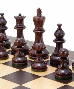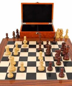 L’ensemble French Knight Echiquier en Bois d’Acajou et Erable, Jeu d’Echecs en Bois de Rose Doré et Buis & Coffret de Rangement en Bois de Bouleau est un ensemble de jeu de grande qualité, parfait pour tous les joueurs d’échecs. L’échiquier est fait avec des matériaux de qualité supérieure, acajou et erable, avec une taille de 50 x 50 cm et des cases de 4,8 cm. Il est entièrement fabriqué en Europe pour la plus haute qualité. Les pièces d’échecs elles-mêmes sont faites de bois de rose doré et buis et plombées x3. Chaque pièce est sculptée et polie à la main pour une finition professionnelle et haut de gamme. Chaque pièce a une hauteur du roi de 8,3 cm et il y a 32 pièces en tout. Le coffret est é