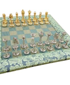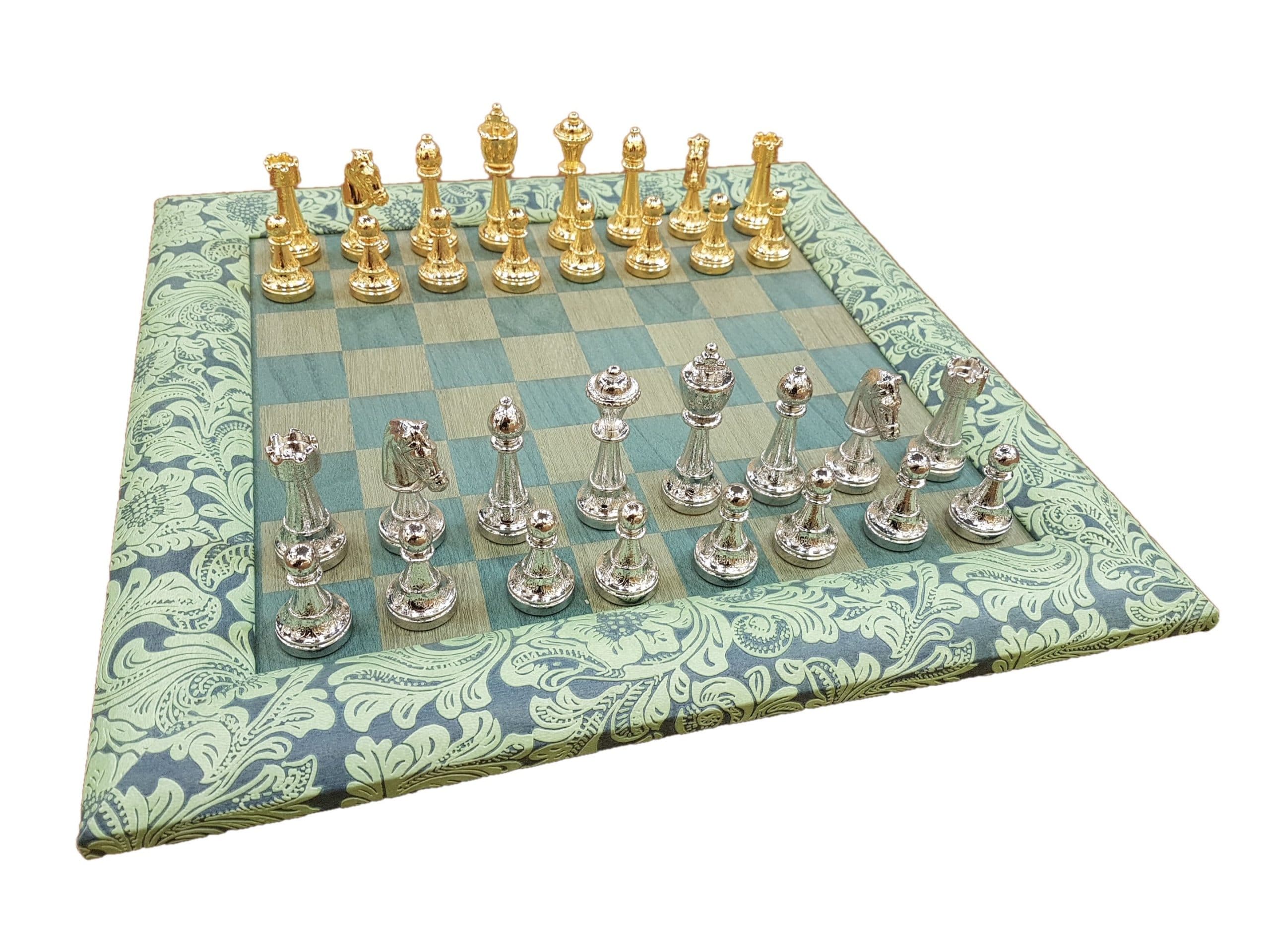 Ensemble d’Echecs en Bois et Cuir avec Pièces en Métal Plaqué Or/Argent – Classic Flower 7