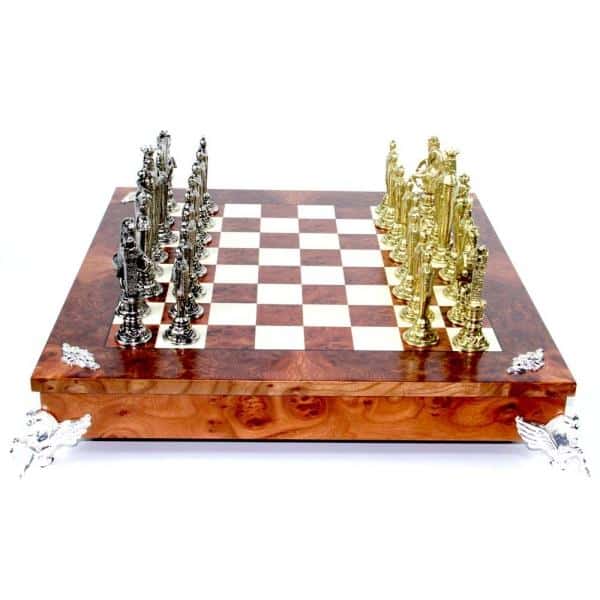 L’Ensemble Florentine Renaissance II Echiquier sur Pied en Bois d’Orme et de Bruyère et Jeu d’Echecs en Métal est un ensemble très élégant et soigné. L’échiquier est fabriqué à partir d’un mélange de bois d’Orme et de Bruyère avec une taille de 55 x 55 x 10 cm et des cases de 5 cm. La finition est mate et la fabrication européenne. Le jeu d’échecs est fabriqué avec des matériaux massifs métalliques et a une hauteur du roi de 13,8 cm et un diamètre base du roi de 3,8 cm. Chaque jeu est composé de 32 pièces et est poli et sculpté à la main. La fabrication est européenne. Cet ensemble est le choix parfait pour tout amateur d’échecs et suscitera l’admiration de tous. Profitez de cet ensemble pour donner à votre je