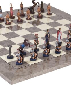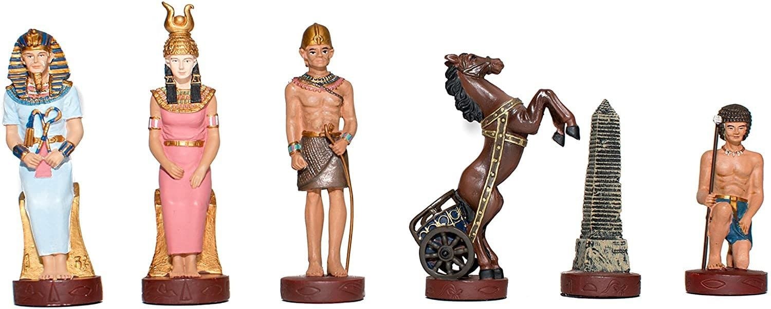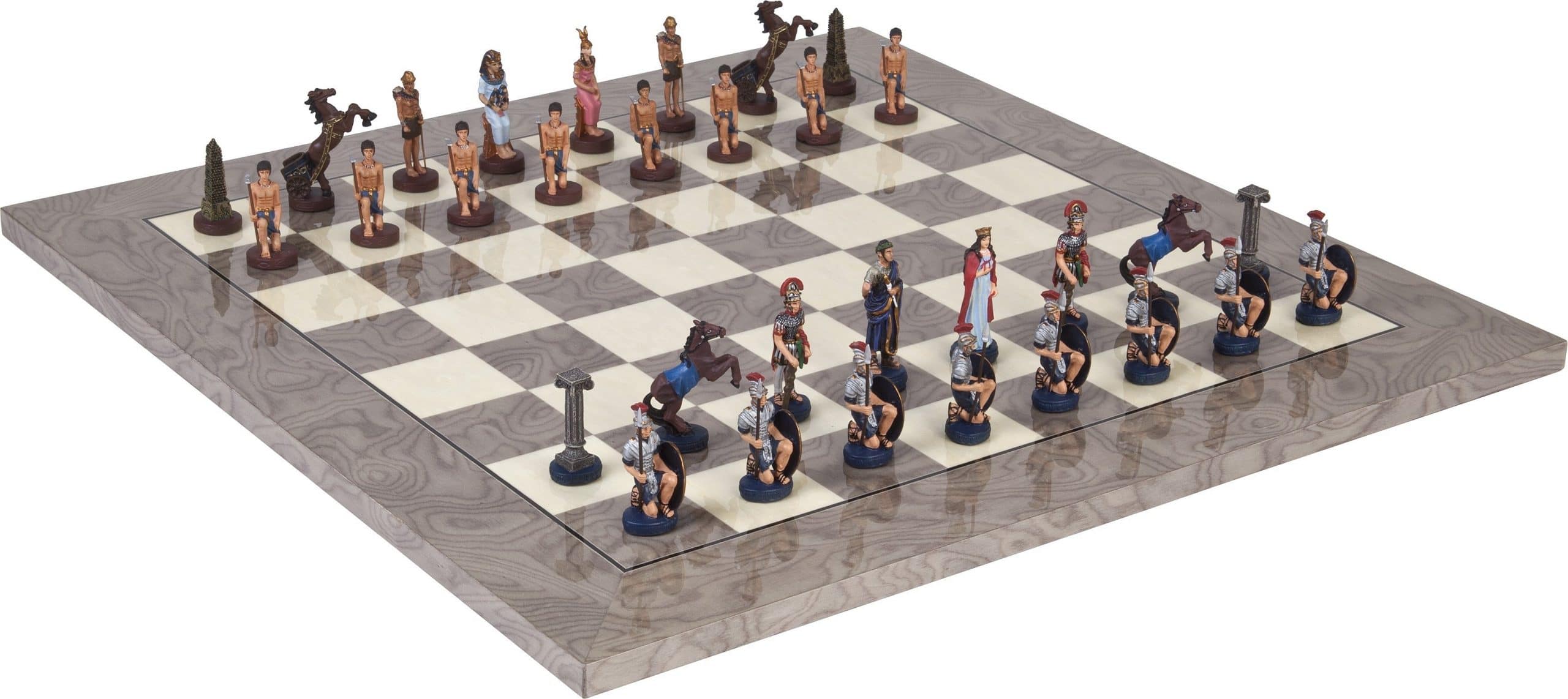 Ensemble Echecs Romains vs Egyptiens II: Echiquier en Bois et Jeu d’Echecs en Etain Peint à la Main