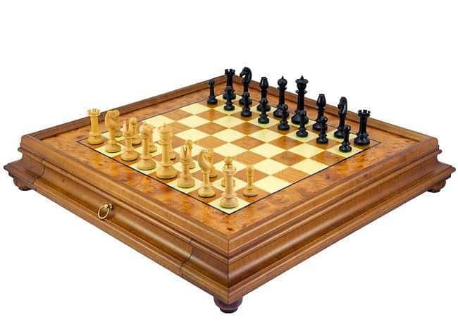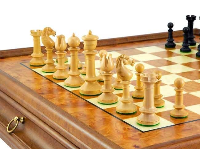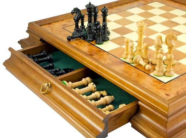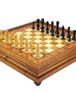 Ensemble Echiquier sur Pied Bois d’Orme & Jeu d’Echecs Bois d’Ebène & Buis avec Tiroir de Rangement – Le Nord