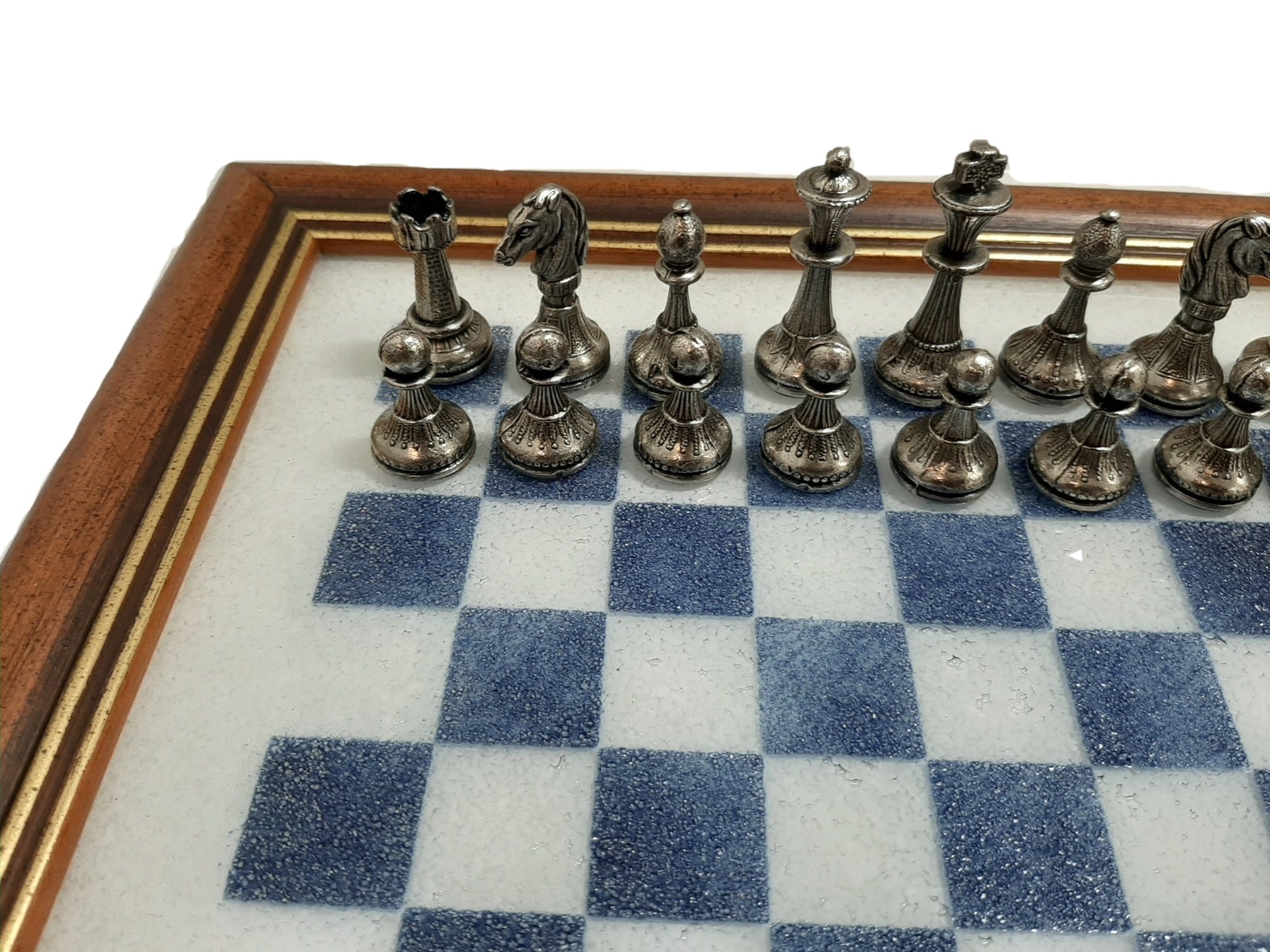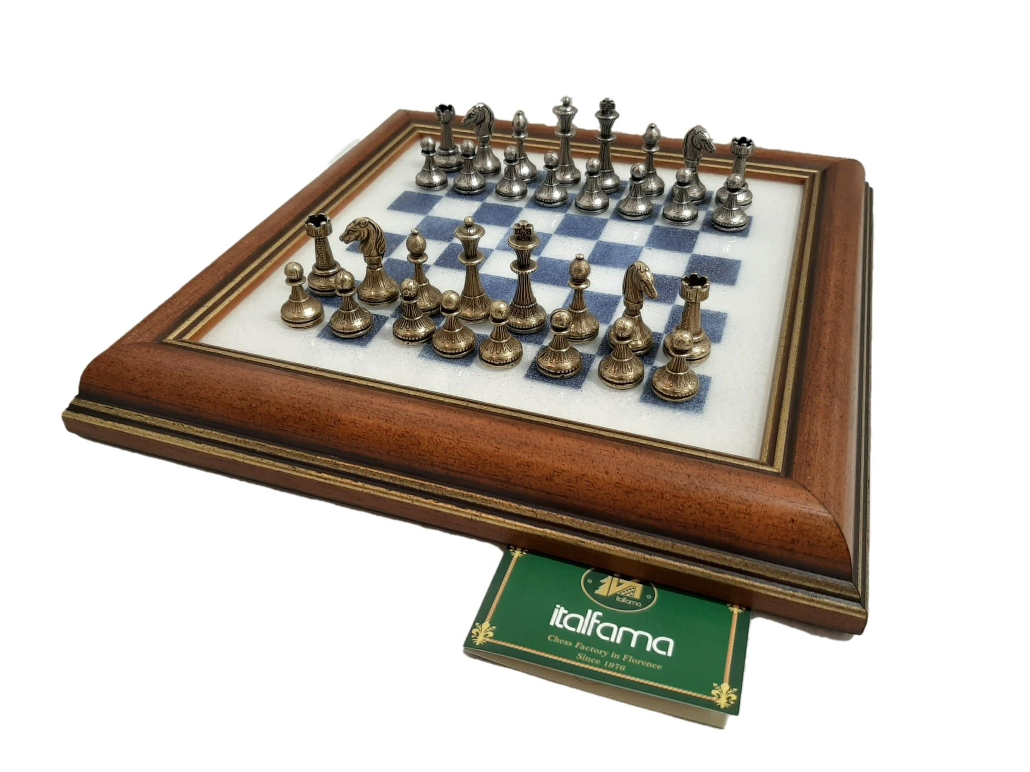 Le Petit Ensemble Mignon Flower XII Echiquier Plateau en Verre Vénitien et Jeu d’Echecs en Métal est un ensemble élégant et riche en détails. L’échiquier est fait à la main, avec un cadre en bois et un verre vénitien, et mesure 33 x 33 cm. Les pièces du jeu d’échecs sont faites en métal massif, avec une hauteur du roi de 4,8 cm et un diamètre de base du roi de 1,9 cm. Toutes les pièces sont faites à la main, sculptées et peintes avec une finition de qualité, et sont livrées avec une base en feutre. Fabriqué en Europe, cet ensemble est un produit de qualité, fait avec soin et attention aux détails. Une fois assemblé, cet ensemble mignon Flower XII est un jeu d’échecs classique et élégant qui ajoutera