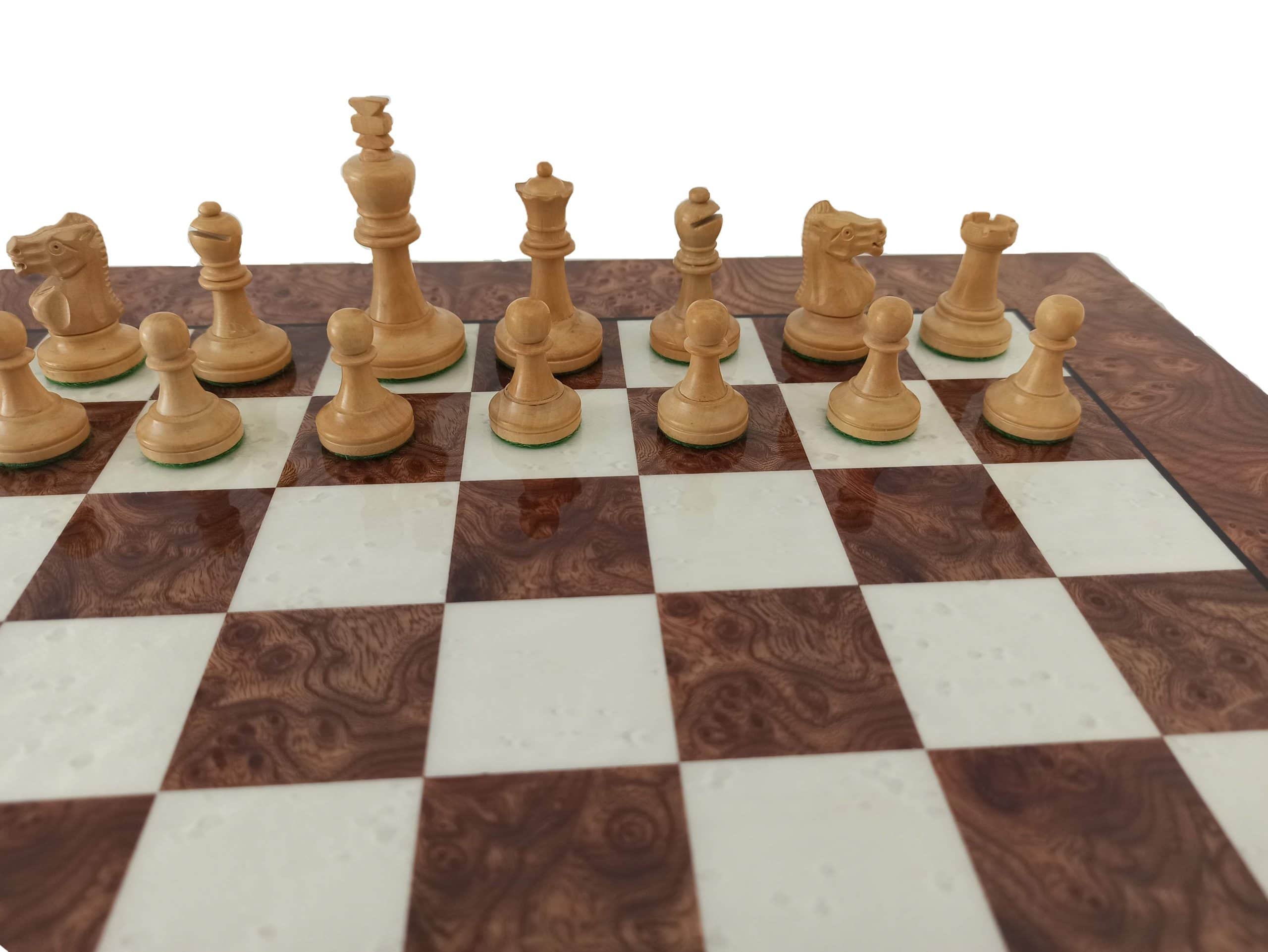 Ensemble Jeu d’Echecs Haut de Gamme en Bois d’Orme et d’Erable avec Pièces Plaquées Or et Argent