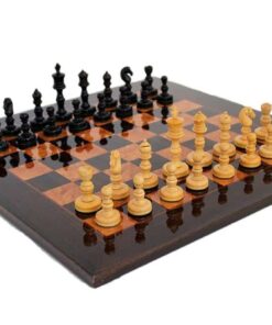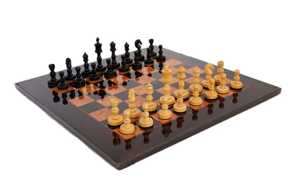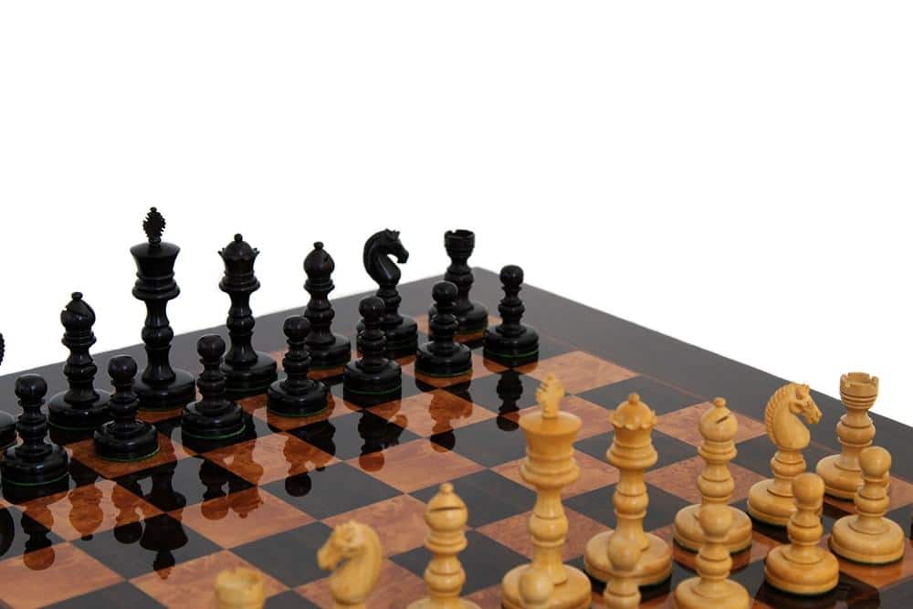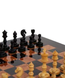 Ensemble Jeu d’Echecs Emporium II en Bois d’Ebène et Echiquier en Bois de Loupe, Madrone, Eucalyptus et Bruyère Laqué