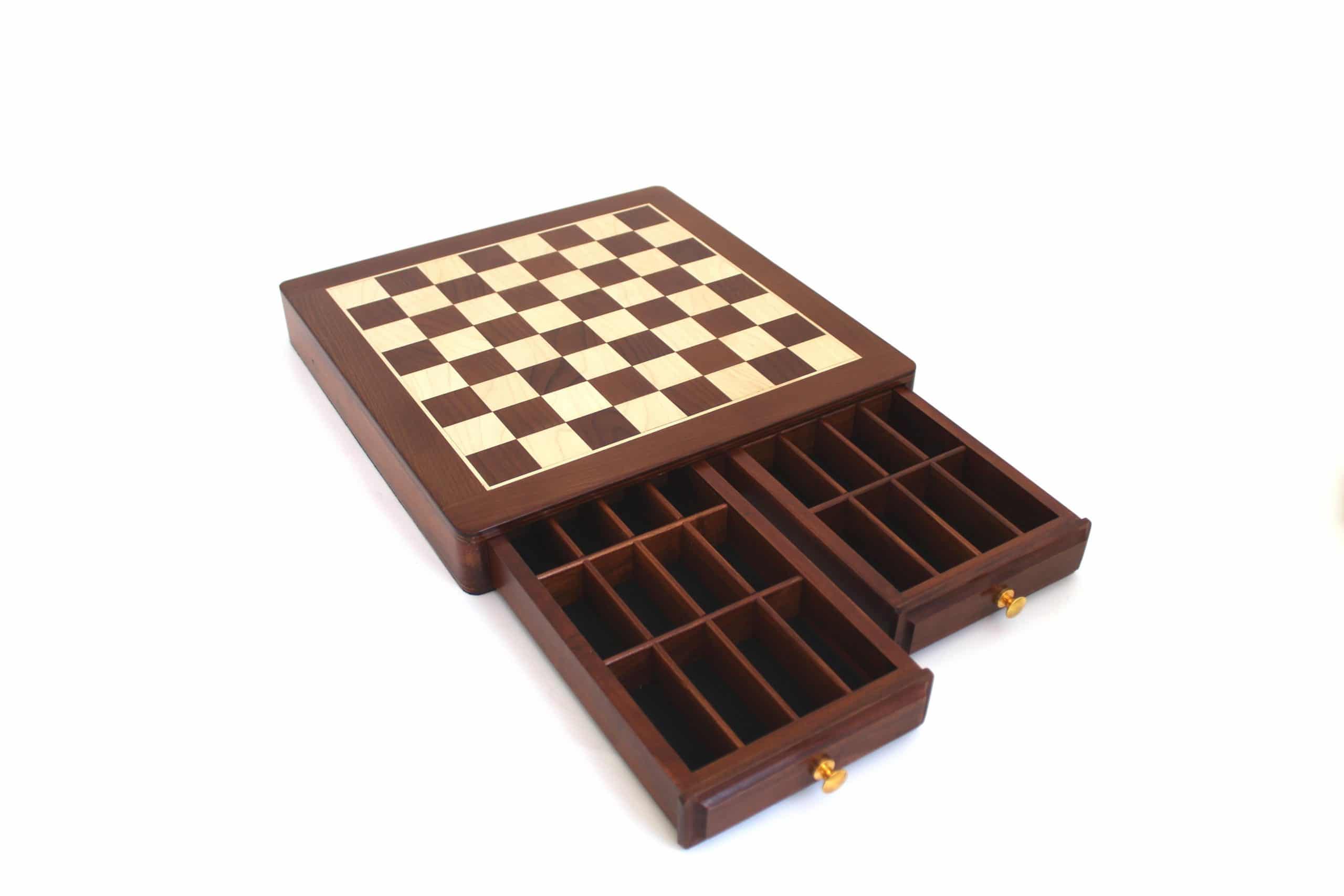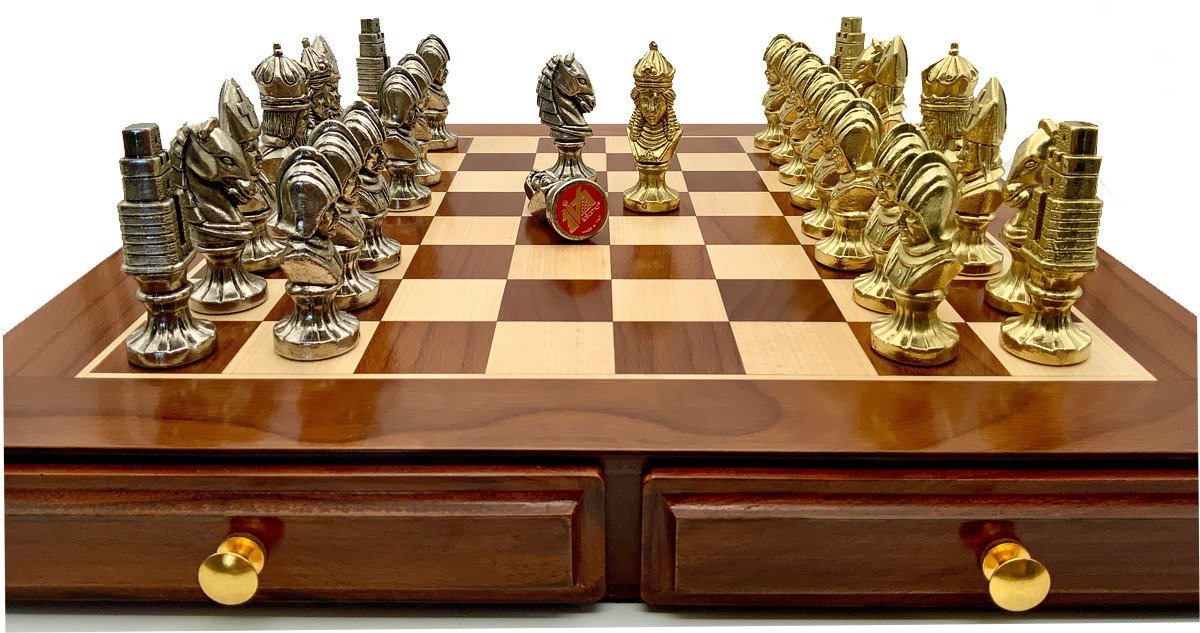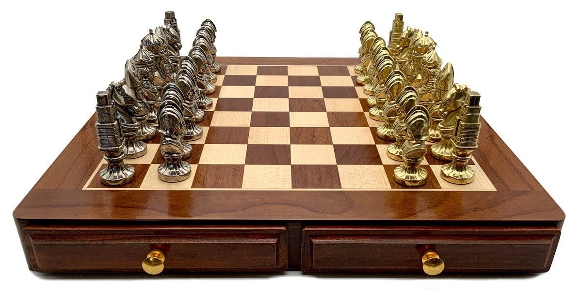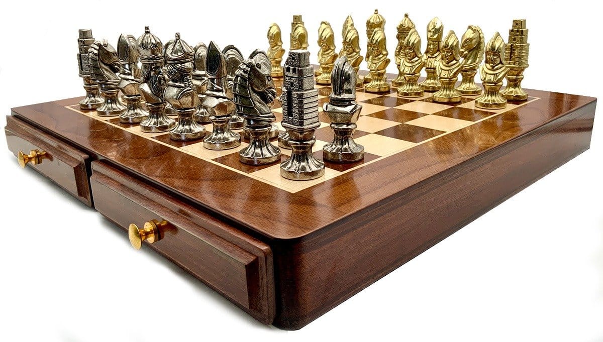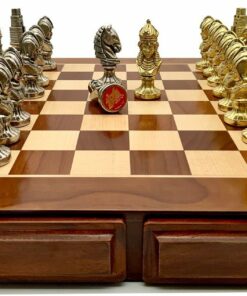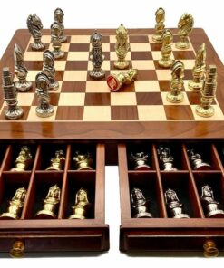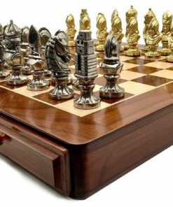 L’Ensemble Medieval IV Echiquier en Bois d’Erable & Jeu d’Echecs en Métal est un jeu de qualité supérieure, conçu et fabriqué en Europe. L’échiquier est conçu à partir de bois d’érable et mesure 46 x 46 x 6 cm. Les cases sont de 4,5 cm et comprennent un double tiroir de rangement intégré, tous deux faits à la main. Le jeu d’échecs est composé de métal massif, avec un roi mesurant 9,3 cm de haut et 3,1 cm de diamètre de base, avec 32 pièces au total. Il est soigneusement sculpté et ciselé à la main, et sa base est en feutre. Ce jeu haut de gamme offre une expérience de jeu authentique et durable. Il est parfait pour les joueurs débutants et avancés et s’adaptera à tout type de jeu. Off