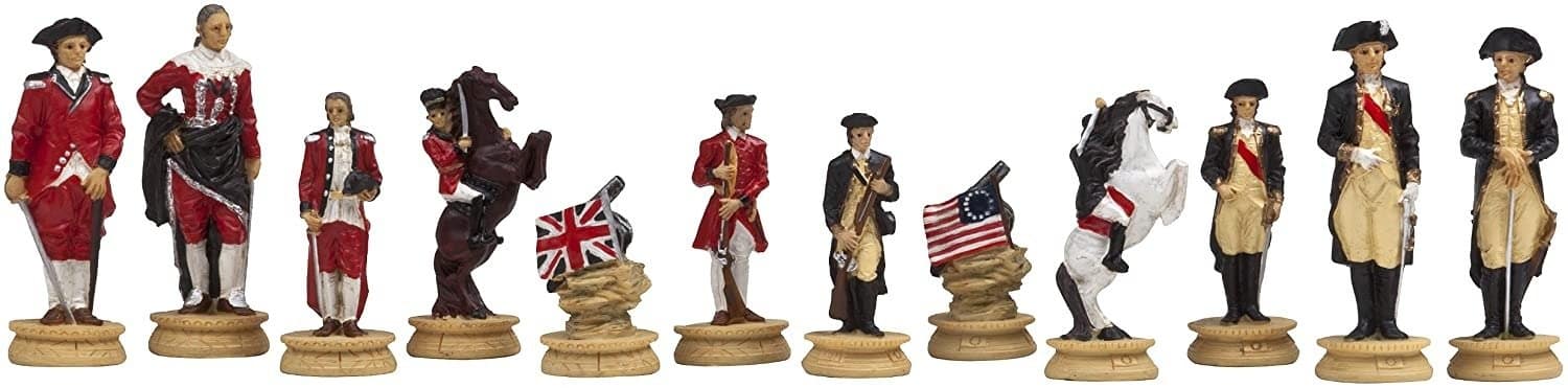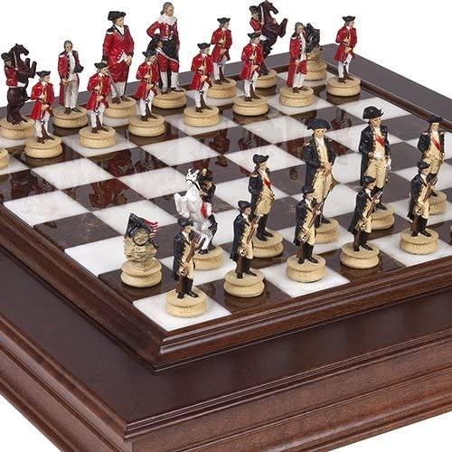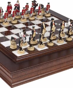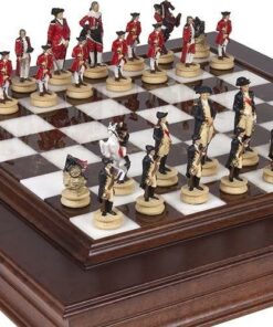 L’Ensemble Révolution Americaine III Echiquier en Bois Plateau en Marbre et Jeu d’Echecs en Etain est un jeu d’échecs classique exquis. L’échiquier est fabriqué à partir de bois et de marbre de Carrare de qualité supérieure et mesure 50 x 50 x 8 cm avec des cases de 4,5 cm. Le plateau est fini avec un marbre antique pour ajouter à l’esthétique. Le jeu d’échecs est en étain et chaque pièce a une hauteur de 8 cm et un diamètre de base de 2,5 cm. Les pièces sont entièrement peintes à la main et sont soutenues par une base en feutre. Tout le jeu est fabriqué en Europe, ce qui garantit sa qualité et sa durabilité. Offrez à vos amis et à votre famille ce jeu classique et élégant et profitez de moments exceptionnels autour de l