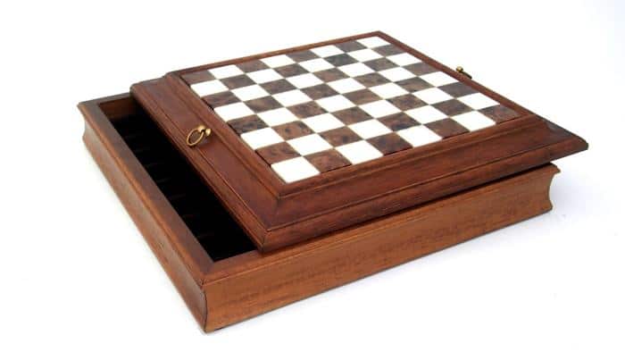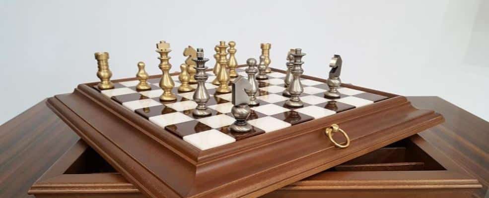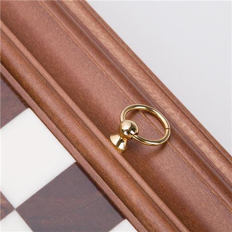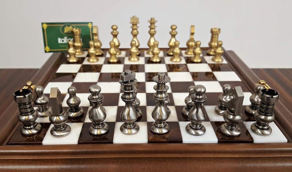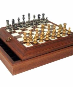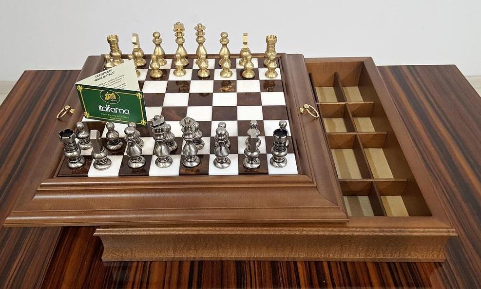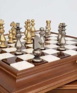 Ensemble Style Français Echiquier en Bois Massif & Plateau en Albâtre avec Jeu d’Echecs en Laiton Massif & Compartiment de Rangement