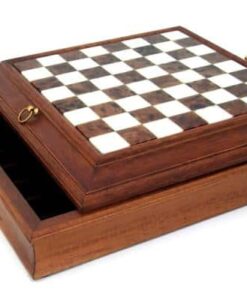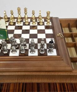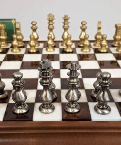 L’Ensemble Style Français Echiquier en Bois Massif et Plateau en Albâtre avec Compartiment de Rangement & Jeu d’Echecs en Laiton Massif est un produit à couper le souffle. L’échiquier est composé de bois massif et d’albâtre et mesure 37 x 37 x 8 cm. Les cases ont une taille de 3,2 cm et sont finies à la main pour un look luxueux et classique. Le jeu d’échecs est composé de laiton massif avec un plombage x3 et les pièces sont hautes de 6,5 cm avec une base de 2 cm. Les pièces sont polies et sculptées à la main pour une finition exquise et chaque base des pièces est en feutre vert. Les matériaux utilisés pour cet ensemble sont tous européens et sont fabriqués avec le plus grand soin. C’est le parfait cadeau pour un passionné d’é