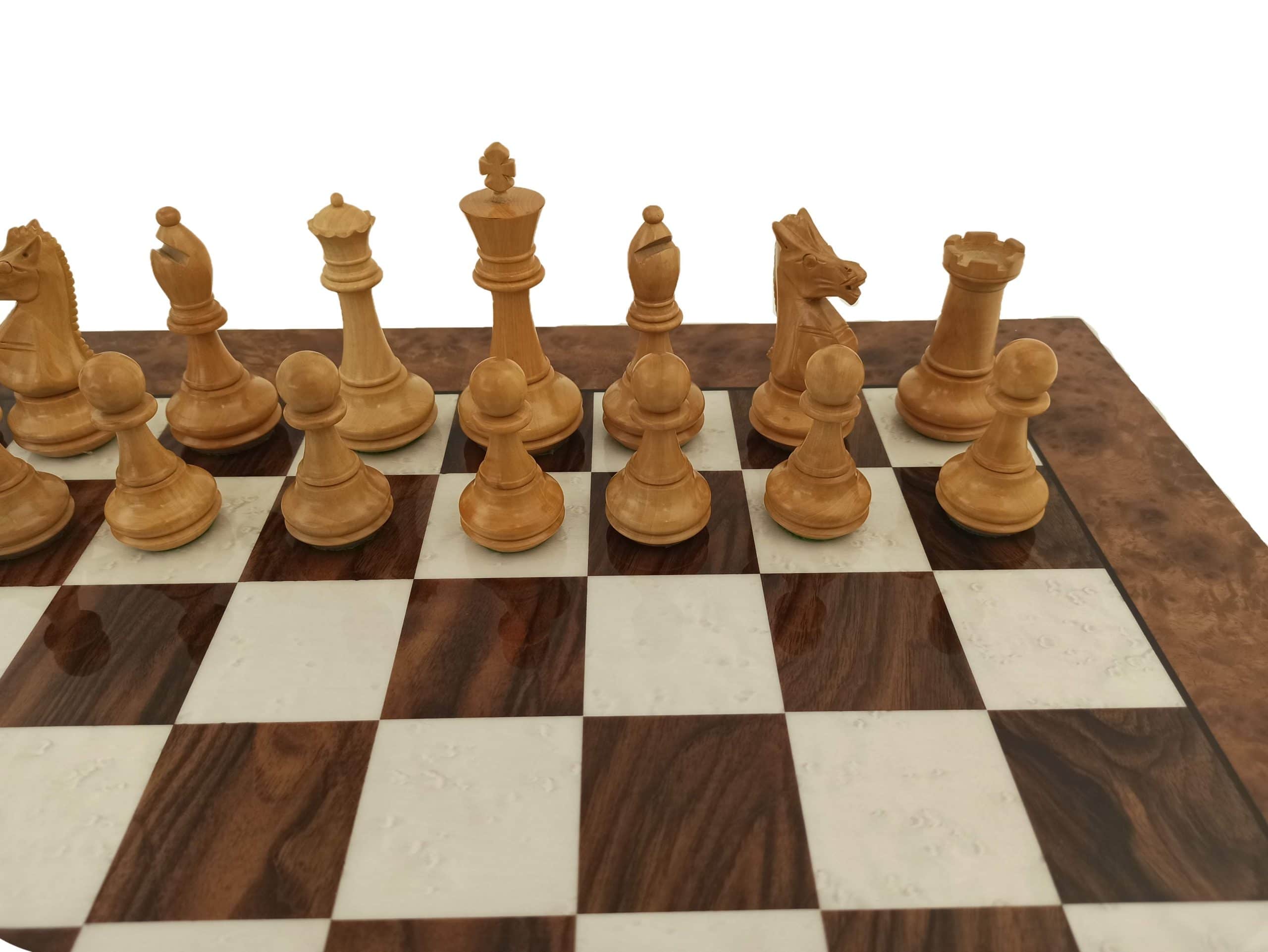 Ensemble Jeu d’Echecs Haut de Gamme en Bois d’Orme et d’Erable avec Pièces Plaquées Or et Argent