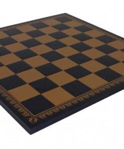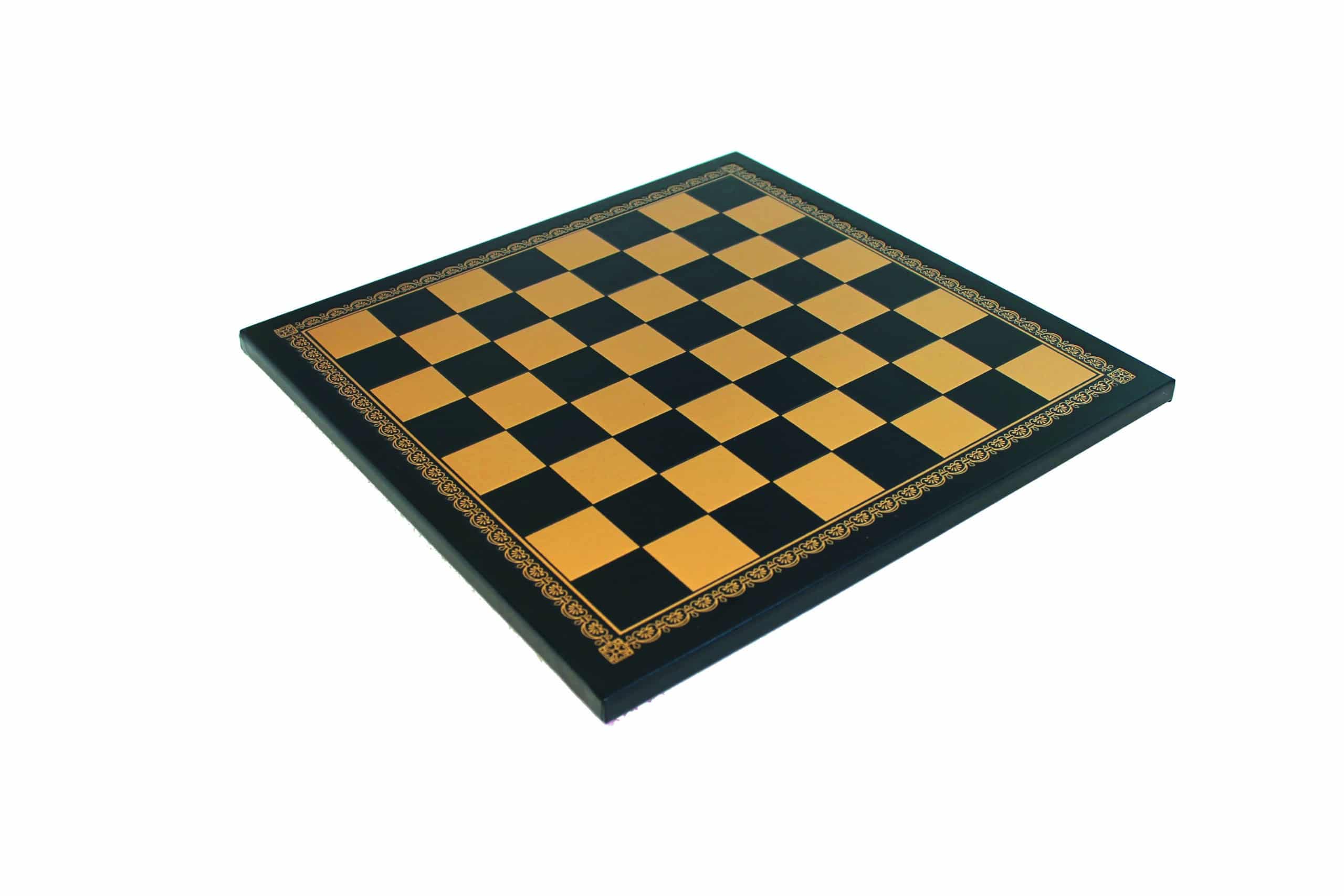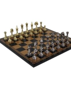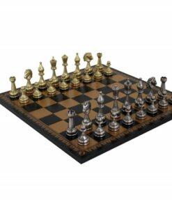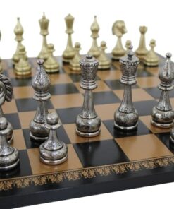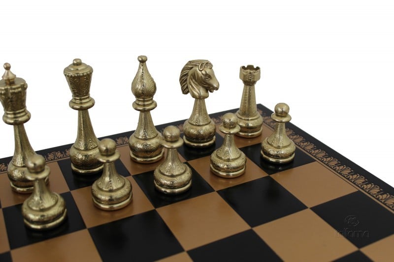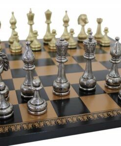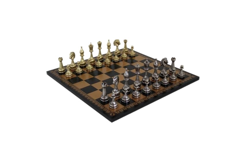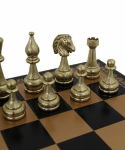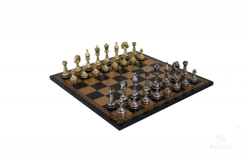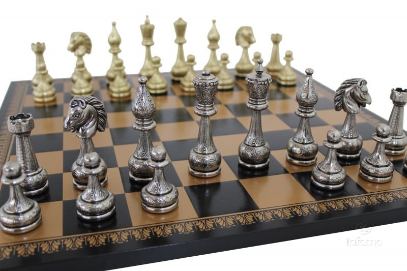 Grand Jeu d’Echecs en Métal Sculpté avec Echiquier en Similicuir Noir et Doré