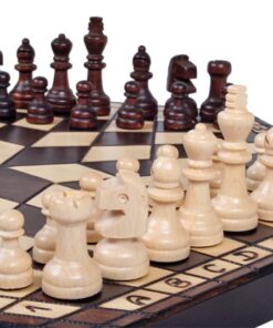 Ce jeu d’échecs unique pour 3 joueurs est de taille moyenne et offre une excellente valeur. Le boîtier de pliage est disponible en couleur standard (Brown) et d’autres couleurs sur demande. Les chessmen sont fabriqués à partir de corne et de bois de hêtre. Chaque ensemble inclut une notice avec les règles du jeu. Il a trois compartiments finis avec une doublure en feutre pour les pièces d’échecs de stockage à l’intérieur. Avec ce jeu de qualité, vous et vos amis pouvez profiter d’un après-midi d’échecs entre amis. Vous serez heureux de l’acheter pour votre collection. C’est un excellent ajout à votre jeu de table. Essayez le jeu d’échecs 3 joueurs moyen et amusez-vous!.