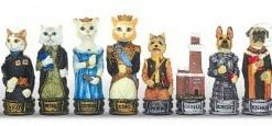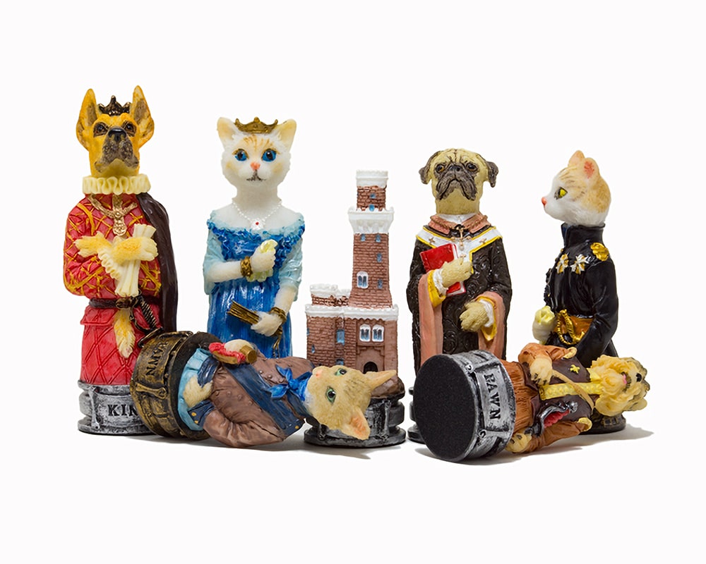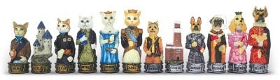 Jeu d’Echecs Chiens et Chats en Résine + Échiquier en Similicuir Bordeaux et Doré