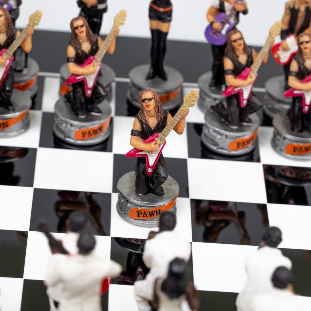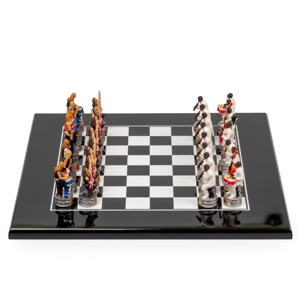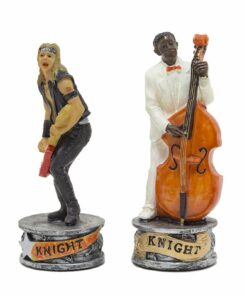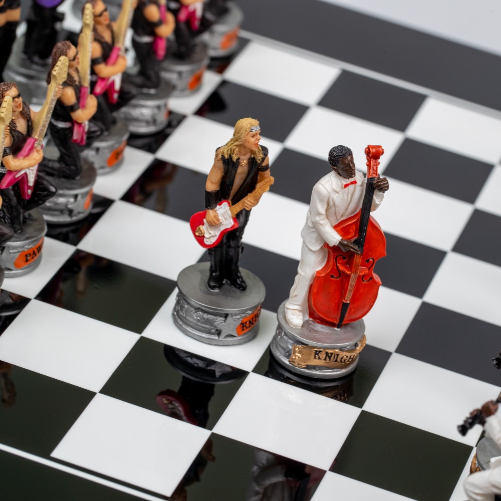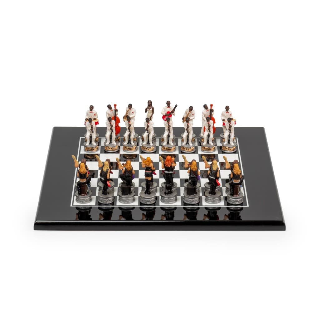 Jeu d’Échecs Jazz vs Rock – Échiquier en bois laqué noir & Pièces en résine: Jouez le Duel Musical!