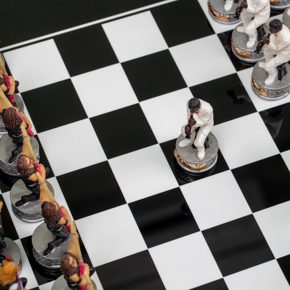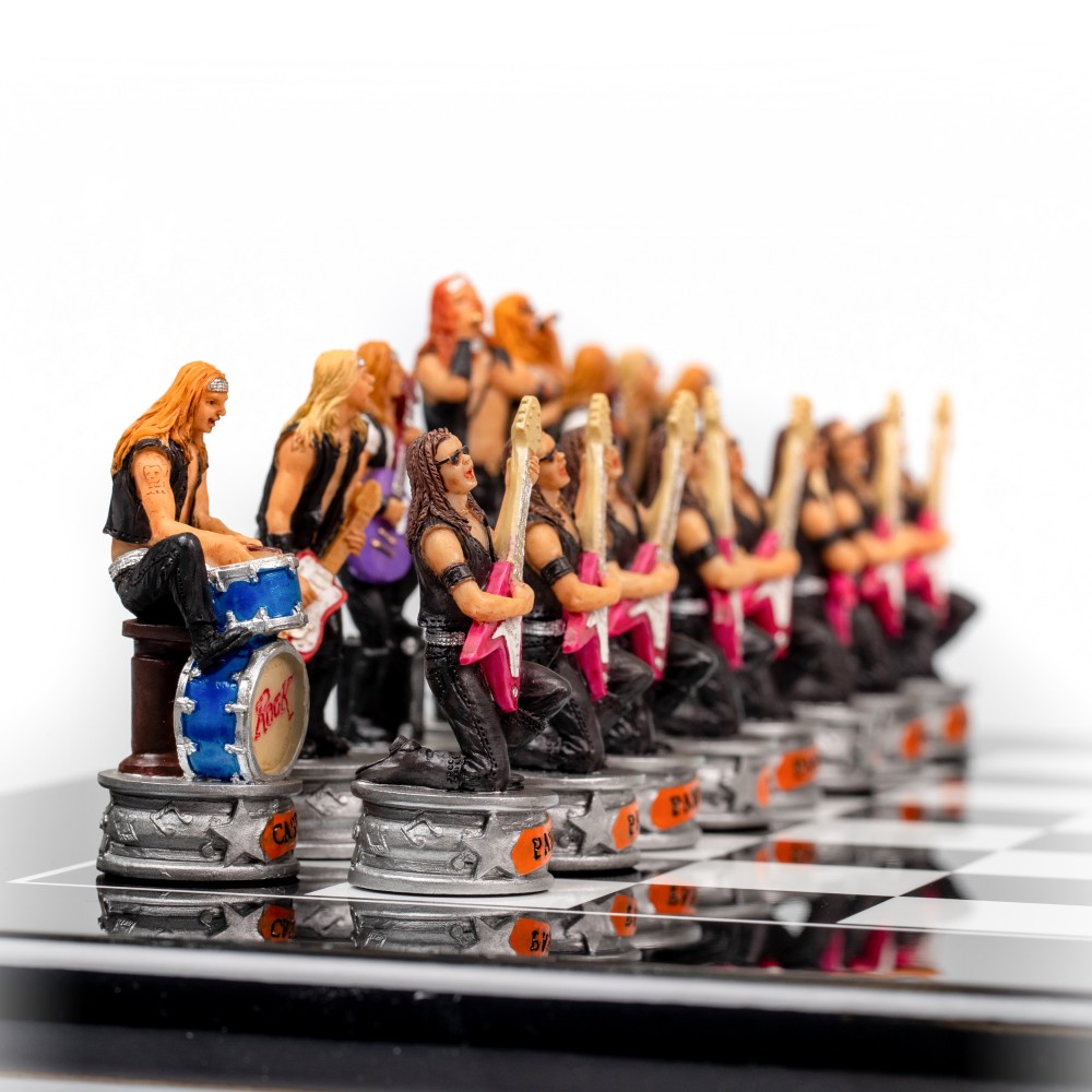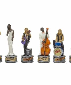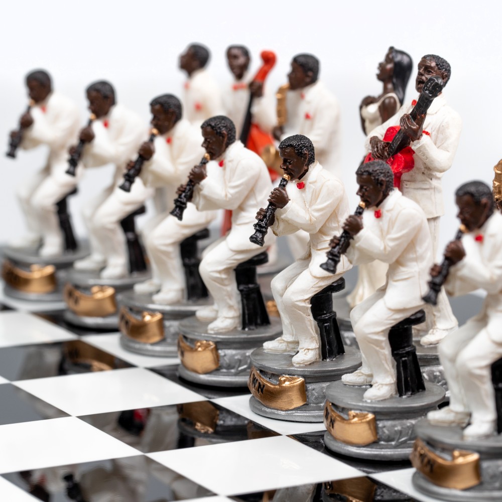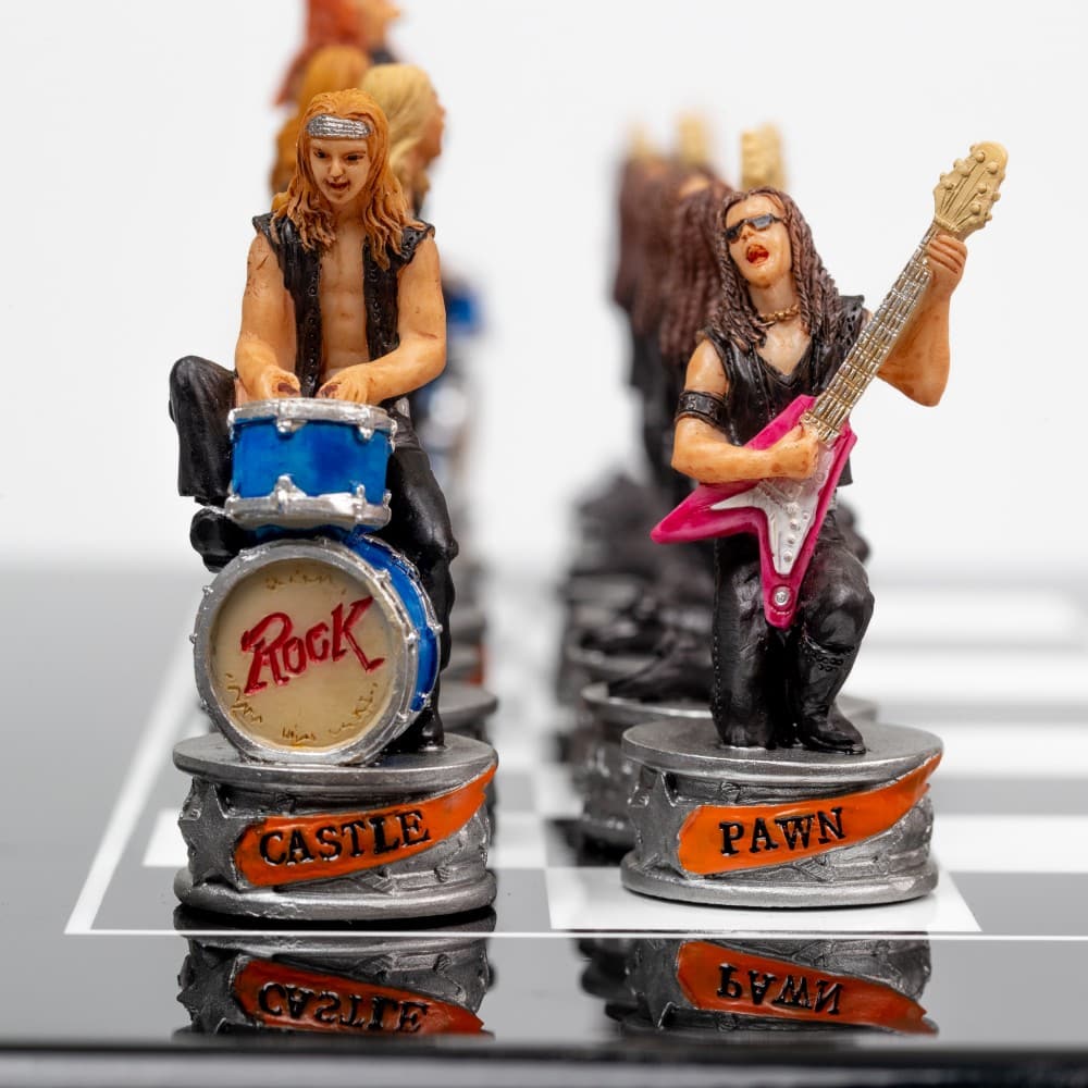 Jeu d’Échecs Jazz vs Rock – Échiquier en bois laqué noir & Pièces en résine: Jouez le Duel Musical!